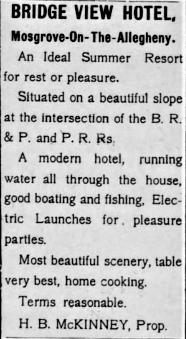 The Bridge View Hotel, with its 45 rooms and a bar, attracted hundreds of tourists from Pittsburgh, who made the trip on the Pennsylvania Railroad and on the sternwheeler “Nellie Hudson” when water conditions were favorable, to experience a quiet vacation overlooking the beautiful Allegheny River. John Henry Rebold built the Bridge View Hotel in 1901. In 1902, John Rebold moved to Oklahoma where he amassed a fortune in drilling for oil and natural gas. His brother-in-law, William A. Heinrich operated the hotel for John for four years. At some point, H. B. McKinney became the proprietor, as the ad at the left shows. It was published in the Butler Citizen in 1906. Later John Rebold’s son Grant became the proprietor of the hotel.